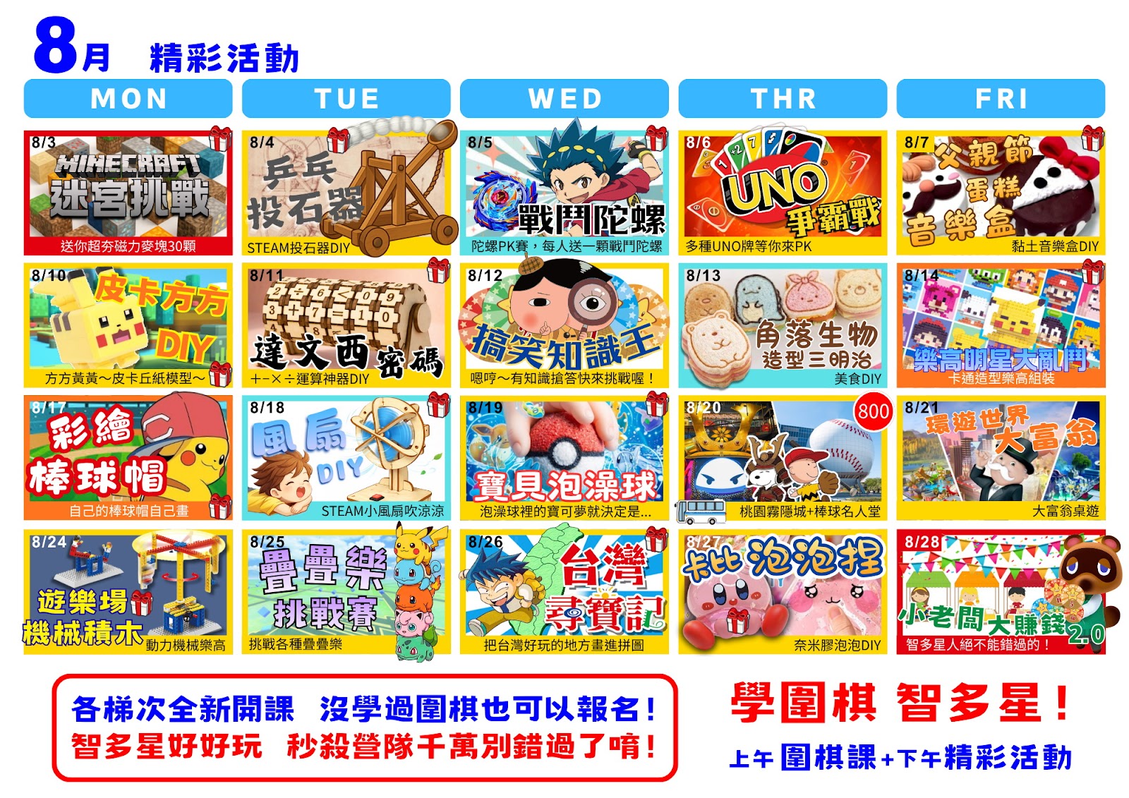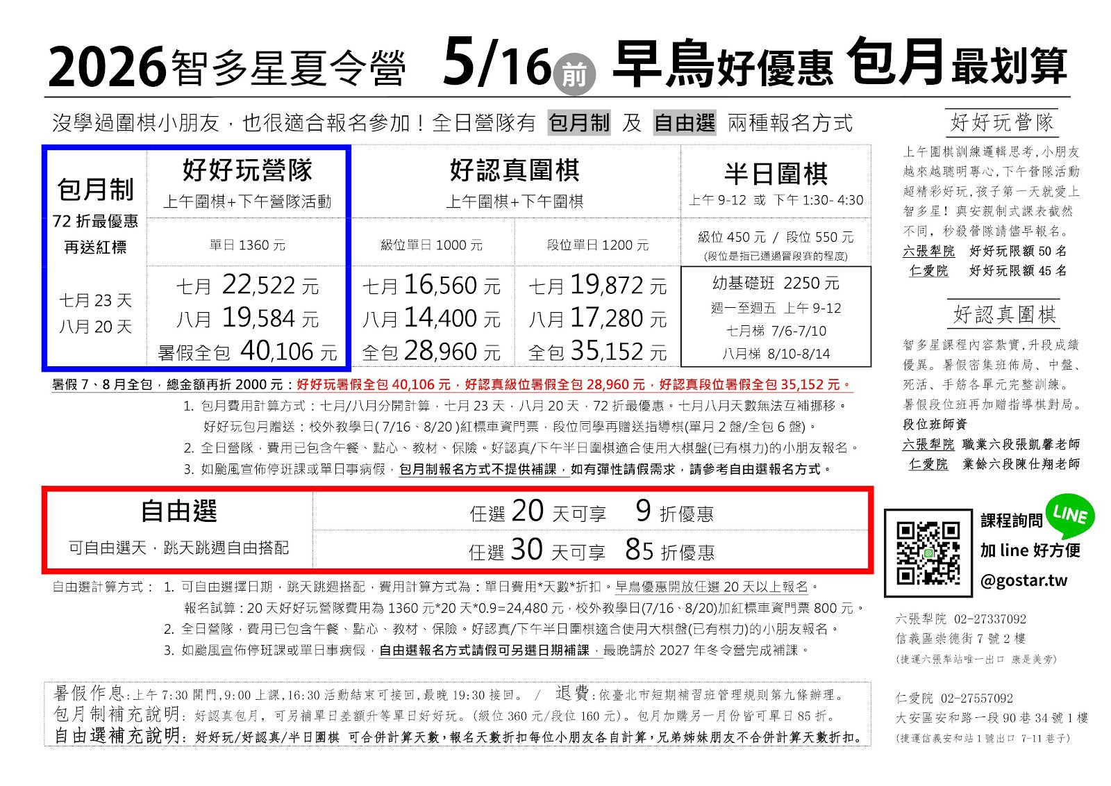 單純學圍棋,不跟營隊活動的幼兒園小朋友,請報名此梯次,暑假梯次是上午: